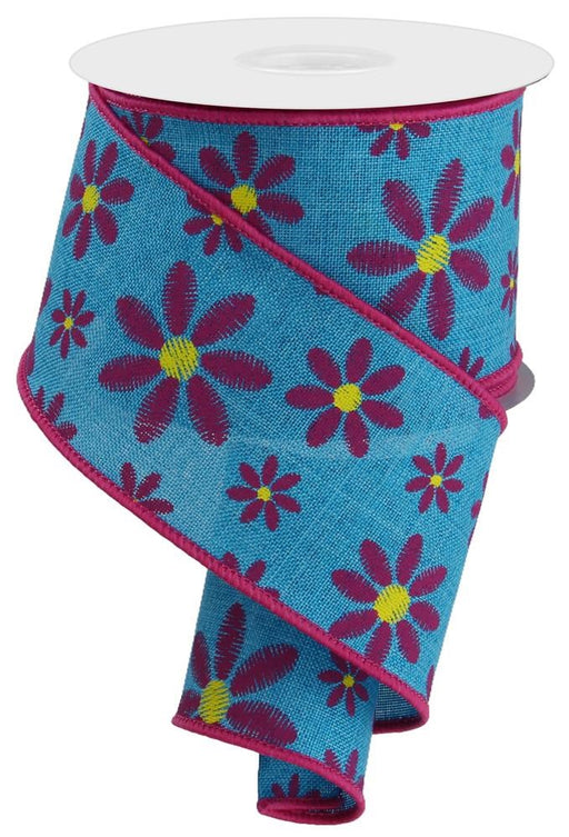 2.5"X10Yd Embroidered Mixed Daisy Turquoise/Fuchsia/Yellow RGE1192A2